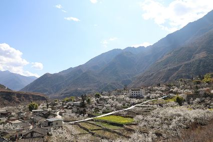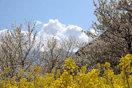 在瀘定縣冷磧鎮(zhèn)、德威鎮(zhèn)等地,桃花、油菜花及櫻花競相開放,一團團、一簇簇,綴滿枝頭,藍天、白云與各色花兒相交,金黃花海在微風中起伏。一畦畦油菜花田錯落有致、層次分明,綿延不斷?!岸聶鸦ㄩ_,三月桃花盛,四月紅櫻桃,五月水蜜桃?!背擞筒嘶?,每年陽春三月,瀘定的桃花也隨著和煦春風落滿枝頭滿樹的花芽沁著香氣,一點點溢到空氣中,香了春風,也香了整座城。