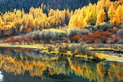 珍珠海周邊層林盡染,圍繞海子一圈,和雪山一起倒影湖面,分不清天空和水下,分不清上下真實(shí)。