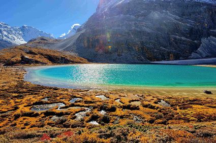 每年10月是稻城最美的季節(jié),初秋的稻城已經(jīng)是絢麗多彩的,大片大片的高原草甸逐漸變?yōu)辄S綠色,環(huán)抱高原海子的水草也由養(yǎng)眼的綠色向迷人的金色過(guò)渡。