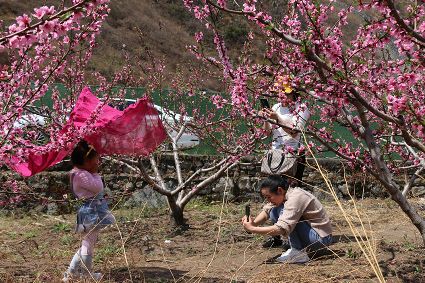 這個(gè)時(shí)節(jié),著名的賞花之地當(dāng)屬瀘定縣冷磧鎮(zhèn)杵坭的桃花谷。從瀘定縣城出發(fā),沿著大渡河右岸一路往下,行約20分鐘就能看到美麗的田野景色。只見(jiàn),山頭上,田野間,或是房前屋后,統(tǒng)統(tǒng)換上了美麗誘人的春裝。放眼望去,李花、桃花、油菜花競(jìng)相綻放,爭(zhēng)奇斗艷。這里,桃花尤其繁盛,沿著山谷錯(cuò)落有致、次第盛開(kāi),讓人目不暇接,用一步一景來(lái)形容也一點(diǎn)不為過(guò)。