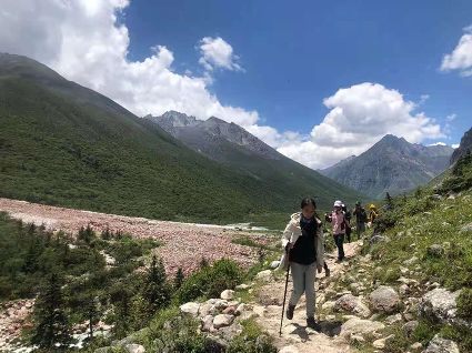 徒步過程中,可以看見貢嘎衛(wèi)峰五色山系,沿途還能看見各種高山植物。雖是為看紅石灘,但看到的不僅僅是紅石灘的美,雪山、河流、草原、瀑布、冰川……一路美景逐一呈現(xiàn)。