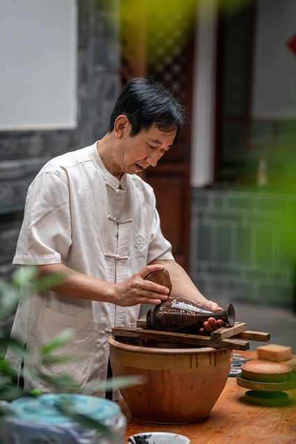 生活在云南省紅河哈尼族彝族自治州建水縣碗窯村的徐榮洪是當?shù)匦旒腋G的第五代制陶藝人,也是非遺建水紫陶燒制技藝的傳承人。 泥料制備、拉坯造型、濕坯裝飾、雕刻填泥、高溫燒制、無釉磨光……要想做出精良的紫陶工藝品,每個流程都需要潛心鉆研。“制作技藝環(huán)環(huán)相扣,某一道工序出現(xiàn)紕漏,燒出來就是瑕疵品?!?徐榮洪拿起刻刀,對陶坯表面開始進行雕刻。 今年57歲的徐榮洪小時候就跟著長輩上山挖陶泥,多年來堅持鉆研建水紫陶的制作技藝。 徐榮洪介紹說,作為紫陶藝人,以陶為紙,根據(jù)器型將不同的文化與藝術形式注入其中,使其具有無限活力。非遺文化閃爍著人類智慧的光芒,也承載著人們心底的情思鄉(xiāng)愁。