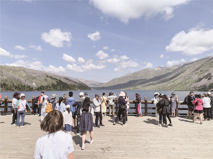 晨曦微露,湖面如鏡子般平靜透亮,倒映著藍(lán)天、白云、高山和白雪;傍晚時(shí)分,夕陽(yáng)西下,波光粼粼的湖水如金子般閃耀。
