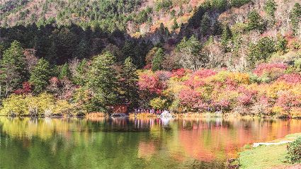 水面碧波蕩漾,不帶有一絲瑕疵,樹(shù)木金黃色,鮮艷的杜鵑花在縱情歌唱,一切都那么原汁原味。