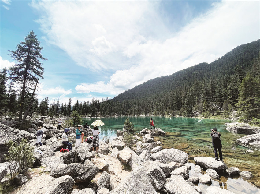 措普溝匯集了山川景物的精華,雪峰、冰川、原始森林、湖泊、河流、峽谷、瀑布、溫泉、草原、野生動(dòng)植物、藏族風(fēng)情。特別是被雪山半環(huán)繞的措普湖,有山有水,顏色層層遞進(jìn),清澈見底,在陽光的折射下波光粼粼。