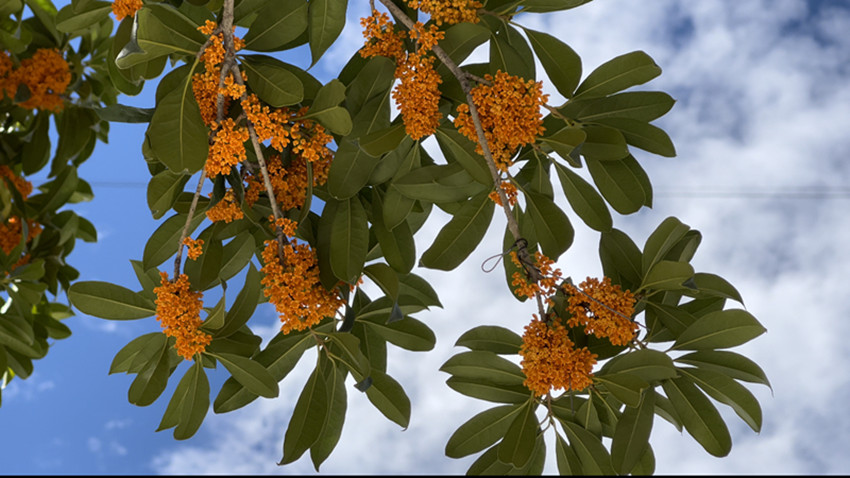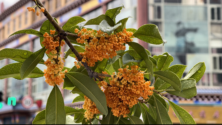 無(wú)間纏綿的秋雨后,漫步在巴塘的街道,悠悠的一股香氣沁入心扉。此時(shí),頭頂?shù)乃{(lán)天,云卷云舒,嬌小的丹桂掛在樹梢枝頭輕輕搖曳,花香詩(shī)意相融于高原江南別有意趣。