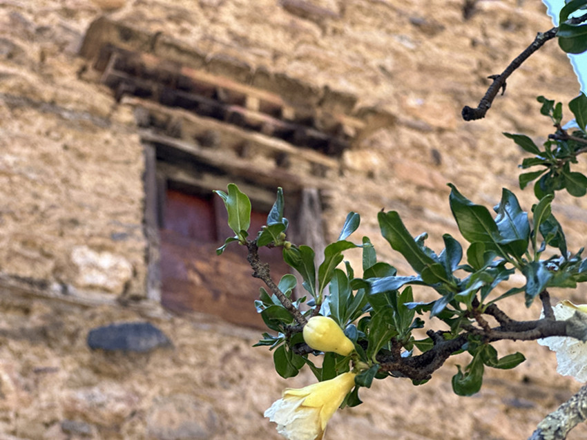 彩色鋪裝的通村路兩邊,成片的苞谷林正在背紅纓,風(fēng)中響著緊密結(jié)實(shí)的聲音。各種果木枝繁葉茂,結(jié)滿了寶石般紅紅綠綠的果子。一排柴垛上方,伸出很大一片橙色的小果子,沒(méi)有葉子,我們像賞花一樣欣喜于它的紅艷。嘉絨姑娘悄默地走在我們身邊,她的手里擺弄著一片草葉,安靜而美好,是感到這一路上的莊稼果木已經(jīng)足夠繁盛。