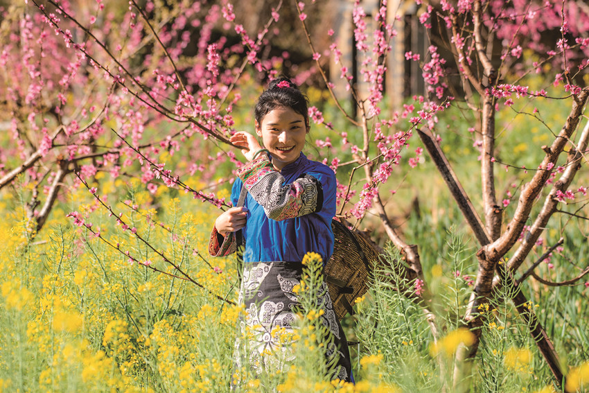 陽春三月,驅(qū)車百里,峰回路轉(zhuǎn),至一小鎮(zhèn),喚烏拉溪,為古驛站。背夫崖下,峻山環(huán)護(hù),小河繞村,屋舍散落,白墻灰瓦,綴以紅檐,桃花夭夭,棧道蜿蜒??图倚∨嘁聥扇?,穿行花間,簪花比俏。昔日荒坡,綠樹成蔭,繁花之下,草莓豆莢,青果胡豆,蔓草芳苓。