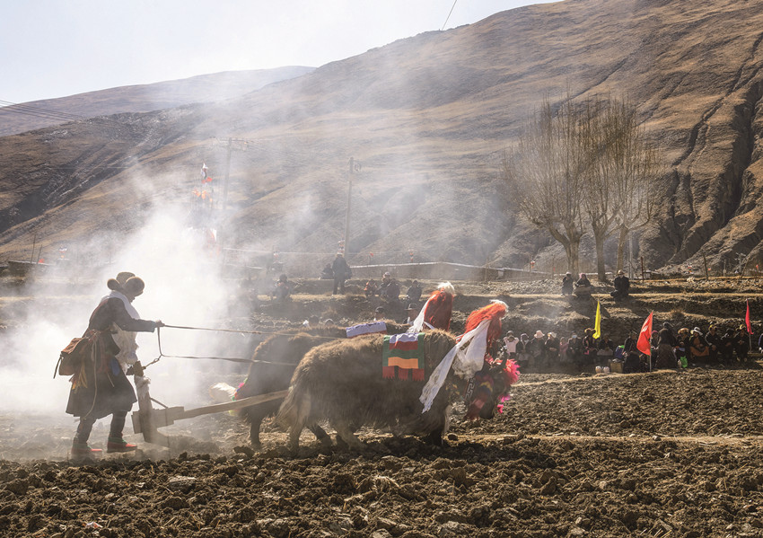 近日,西藏農(nóng)民舉行一年一度春耕大典。村民沿襲著傳承千年的春耕民俗,身著節(jié)日盛裝,手捧“切瑪”(五谷豐登斗),唱起祈愿歌,互敬青稞酒。當(dāng)鐵犁翻開(kāi)土地,婦女將手中的種子撒下,祈求新的一年豐收。