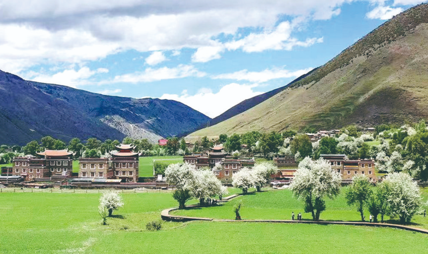 每年5月下旬,貢嘎海棠盛放的甲根壩就瞬間變身為秀美的世外莊園,木雅藏房錯落有致,青稞麥田綠意蔥蘢,潔白的花朵成簇成團,溫暖漫山遍野,微風輕拂,花落成雪,飄滿碧空如洗的天空,花兒灑在田間、落在地頭,在藍色的天空、棕色土壤和青綠色樹葉映襯下,顯得清新至極。