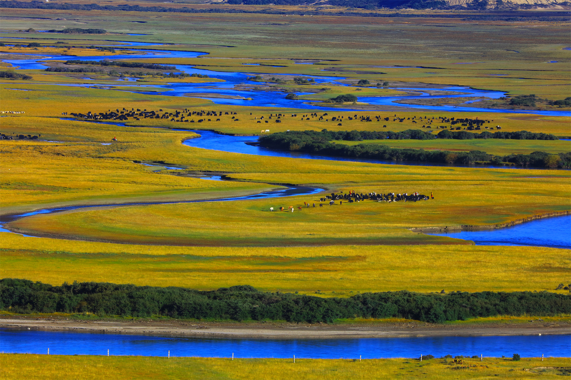 丹頂鶴、水獺、羚羊、青羊、黃鴨、旱獺等野生動(dòng)物混雜其中;清晨,牧民的炊煙裊裊直上與草地上升起的淡淡薄霧混在一起,尤如幻境。