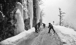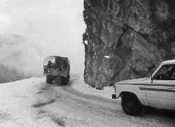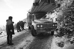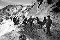 一九九七年十一月二十四日,連續(xù)多日大雪,把整個二郎山裹得嚴(yán)嚴(yán)實實,白茫茫一片。陣陣山風(fēng)吹過,大霧就像瀑布一樣,從山頂直往下翻涌傾瀉。 一大早,州交通局打冰除雪排險的干部職工就從二郎山管理站直奔山埡口。載有防滑砂的大貨車穿迷霧,繞山梁,向山頂埡口疾馳。由于氣溫太低,霧又大,車上的擋風(fēng)玻璃很快就結(jié)下了冰,路面打滑非常嚴(yán)重。前面車輛堵了起來,排險人員只好下車步行。 大霧彌漫,能見度很底,陰霾的天空又飄起了紛紛揚揚的雪花,剌骨的寒風(fēng)陣陣襲來,只聽見車蓬布在風(fēng)中“嗶剝”作響,卻看不見前面到底堵了多少車。排險人員只好相互攙扶踩著冰滑的邊路艱難地向行。好不容易來到堵在最前面的車子面前。原來是一輛載著原木的東風(fēng)牌大貨車側(cè)滑在公路上,把整個公路堵死了。 局領(lǐng)導(dǎo)當(dāng)即指揮大家用鋼釬、鐵鎬和鋤頭處理冰道,沒有撮箕,大家借來加水桶裝運冰雪……氣溫仍在急劇下降,剛從雪堆里刨出來的路,又被結(jié)起一層冰,就像地面上澆上了油,這就是冰雪道上有名的“桐油凌”。 有二位老同志不顧年老體弱,積極參與打冰除雪,一個在打冰時,被彈起的冰碴把腦門劃了一個口子,鮮血直往外冒。有人想幫他包扎,他堅決不干,自己就用手帕按住,把帽子向下拉蓋住傷口就算了。血從手帕中浸透出來,與眉毛上的冰凌結(jié)在一起。氣溫太低,冰層太厚,十字鎬每挖一下,多數(shù)情況下也就是挖下一個白點而已。不一會兒,另一位老同志已是滿頭大汗,大家勸他休息一下,他卻說:趁著現(xiàn)在雪不是太大,早點把主道上的冰雪多除點,過往二郎山的車輛就多一份安全。 排險人員的手凍紅了,刨冰雪碰傷的指頭還流著鮮血,身上蒸發(fā)的熱氣,把衣領(lǐng)口、袖子口和褲子口結(jié)成了冰,可是,誰也沒有吭一聲。 ……受堵車輛終于向前開動了。 風(fēng),越刮越猛,雪,越來越大。 防滑車在冰雪道上艱難地向前爬行著,車箱上面的職工們揮舞的洋鏟向路面撒著防滑砂。一路上風(fēng)絞雪,防滑車象一頭不聽使喚的牛,顛簸、亂竄,好不容易才來到260(二郎山最險處),對這里“桐油凌”路面進行重點防滑處理后,防滑車又返回來,開始向山頂進發(fā)……風(fēng)雪二郎山上打冰除雪、防滑排險,看似沒有驚天動地的壯舉,身臨其景才知其艱難辛苦。難怪當(dāng)年每每經(jīng)過二郎山冰天雪地奇險路段的車,都會向風(fēng)雪中屹立路邊的交通系統(tǒng)排險保暢通的職工們鳴笛致敬,風(fēng)雪中的那份情彌足珍貴。 川藏線上的老司機傳下來一首傷心的順口溜:“車過二郎山,如闖鬼門關(guān),萬幸不翻車,也要凍三天!”其險峻實為罕見,尤其是途經(jīng)二郎山260(公路公樁)處,曾被淡虎色變的人稱為“鬼招手”的險路段。 1983年1月3日,有著安全行車44萬公里記錄的一位駕駛員開著輛嶄新的東風(fēng)牌貨車,同行還有兩名職工,夜行二郎山,在彌天大霧中神秘地“失蹤”了。十五天后,搜山的人才用望遠(yuǎn)鏡看到260公里路樁處的山崖下,有一塊汽車破篷布掛在樹枝,猶如招魂的凄厲幌幡在冷風(fēng)中招搖晃動。鋼纜繩吊著搜山的人下到崖下400米深處的谷底。扒開一座座雪堆,叫人汗毛倒豎:雪堆下,盡是廢大梁、爛車廂、銹車頭和支離破碎的汽車,足有一個汽車連!一輛不知埋了多久的卡車廂里牛肉已腐爛,駕駛室里坐著三具發(fā)黑的僵尸……其狀慘不忍睹!