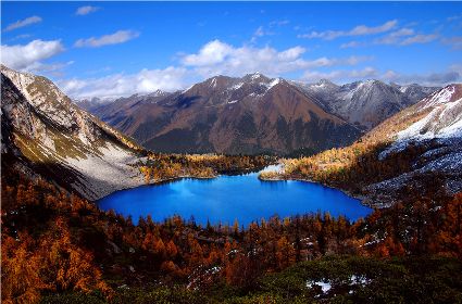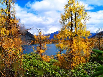 丹巴的秋是有著美麗色彩的季節(jié),你瞧,在峽谷兩岸的山巔,那一簇簇綠樹(shù)在一夜之間竟然點(diǎn)綴上了黃的、紅的顏料,就像是一名丹青能手不小心間打翻了調(diào)色盤(pán),讓那些靈動(dòng)的顏料在樹(shù)冠上潑灑。黃色的樹(shù)葉正印證了“滿(mǎn)樹(shù)盡帶黃金甲”的意境,黃得透徹,黃得潔凈。而那些紅色的樹(shù)葉,猶如盛開(kāi)的鮮花,在逐漸蕭條的秋日里顯露出勃勃生機(jī)……那一片片黃紅綠相間的顏色,一寸一寸的往下挪移,讓看慣了春色綠野滿(mǎn)山的人們驚呼大自然的鬼斧神功之作。山腰,蔥綠的樹(shù)一棵連著一棵,密密層層,頑強(qiáng)地抵抗著秋風(fēng)的寥落,然而,那黃的紅的顏料終歸于要流向峽谷底,所經(jīng)之處,風(fēng)刺骨,葉瑟縮,大地又將再次被剝蝕掉華麗的外衣,露出山的嶙峋。我想,在山巔,那些樹(shù)葉在秋寒的作用下,依依不舍地與樹(shù)枝作別,隨風(fēng)抖落,在樹(shù)林中上下翻飛,猶如一只只美麗的彩蝶在林中翩翩起舞,當(dāng)落到地面上時(shí),發(fā)出生命即將逝去時(shí)的低低嘆息聲,然而那哀傷卻沒(méi)有醞釀太久,幾只小蟲(chóng)迅速地聚集在葉片底下,為尋找到過(guò)冬的庇護(hù)所而興奮不已,那些葉片也感受到了生命存在的意義,為自己即將化為塵土前還能再次發(fā)光發(fā)熱而激動(dòng)。跟隨著秋的步伐,獨(dú)自一人穿行在秋色滿(mǎn)滿(mǎn)的樹(shù)林中。眼前,一片片落葉漫空飛舞,伸出雙手,讓那些黃的紅的葉片降落在手心里,一絲淡淡的蘋(píng)果香味從小小的葉片中透出,悠悠的在我鼻尖縈繞。那一片片落葉,不正是秋日向大地母親發(fā)出的明信片嗎!春夏兩季,大地母親用自己的乳汁哺育著這些葉片,泛著健康的綠色,渲染了大地,茁壯的成長(zhǎng)。那透心的綠,將大地裝扮得格外的妖嬈,充滿(mǎn)了無(wú)限的活力。秋日漸近,它們?cè)谇镲L(fēng)的浸透下,剝蝕掉綠色的外衣,消耗掉多汁的綠葉,逐漸的消瘦,最后薄如蟬翼,在秋風(fēng)的吹拂下,在大地母親的召喚下,終于脫離枝條,晃晃蕩蕩的飄向地面。