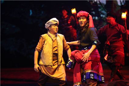 音樂劇《康定情歌》從傳統(tǒng)的男女情上升到了民族的大愛,一幅神秘多彩的藏民族風(fēng)情畫卷緩緩鋪開,一個(gè)動(dòng)人的關(guān)于“情”的傳說,一個(gè)追尋“愛”的故事讓心靈微微一顫。從相識(shí)、阻情、定情、思念、生離到永生,講述了馬幫漢子華君帶著他的馬幫隊(duì)伍來到神秘的康巴地區(qū),在這里,他結(jié)識(shí)了美麗、善良、多情的康巴姑娘康珠,也結(jié)識(shí)了勤勞、勇敢、正直的康巴漢子,他(她)們共同經(jīng)歷了世間最真摯的民族情、友情、愛情、親情,譜寫了一曲曲愛的神話,彰顯了康巴地區(qū)自然和諧的無窮魅力。