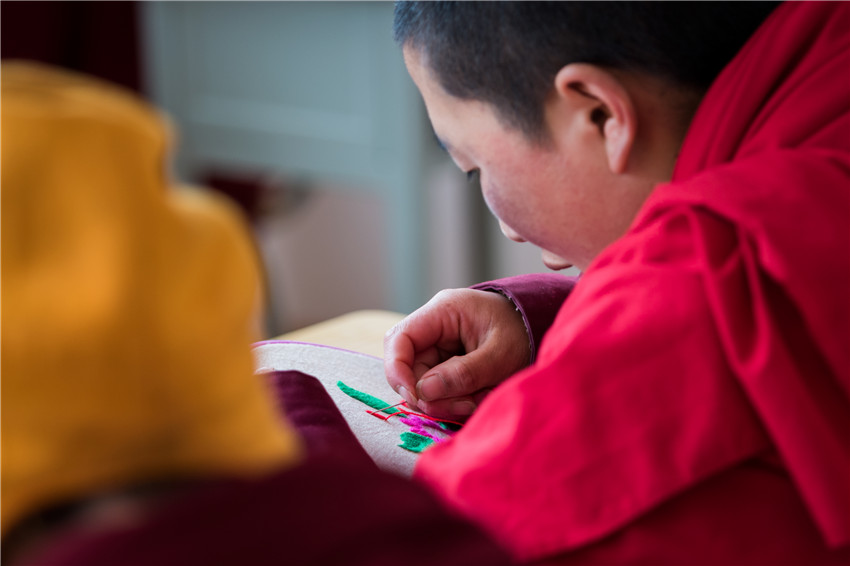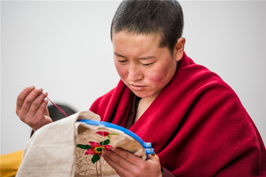 行攝途中經(jīng)過塔公鎮(zhèn)扎西寺,遇見康定市婦聯(lián)邀請到的中國國家級非物質(zhì)文化遺產(chǎn)藏羌織繡傳承人,正在為自愿報名的數(shù)十名覺姆傳授藏繡圖案基礎(chǔ)知識、藏繡圖案的常見表現(xiàn)形態(tài)、挑繡、納花繡、鏈子扣、扎花、提花、拼花、勾花和手繡等各種繡法技能。佛教的學(xué)習(xí)本是無止境的,我被這安靜、專注的場景深深感染,按下相機快門的一瞬就記錄了朵朵盛開在指尖的蓮花。