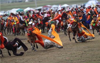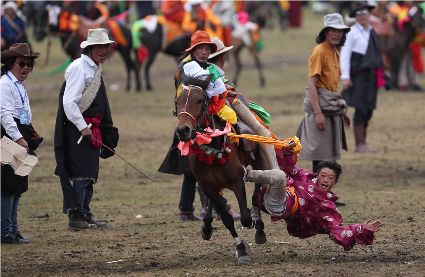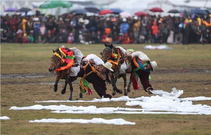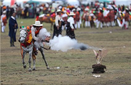 近日,在理塘縣奔戈鄉(xiāng)薩戈村八一賽馬場,來自全縣各鄉(xiāng)鎮(zhèn)近千名牧民進行了傳統(tǒng)的馬術表演,他們以高超的騎術展演了拾哈達、馬上射擊、馬上射箭、鐙里藏身、五彩凌空等馬術技巧,把歡樂帶到草原,讓當?shù)啬撩窈捅姸嘤慰拖硎芰艘粓鲆曈X盛宴。