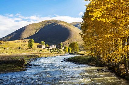 車沿著川藏公路南線前行,一條淺淺的小河與公路相依相偎地蜿蜒流淌。此時(shí)的新都橋,金燦燦的山野,不打折的黃金季節(jié),美得不要不要的。