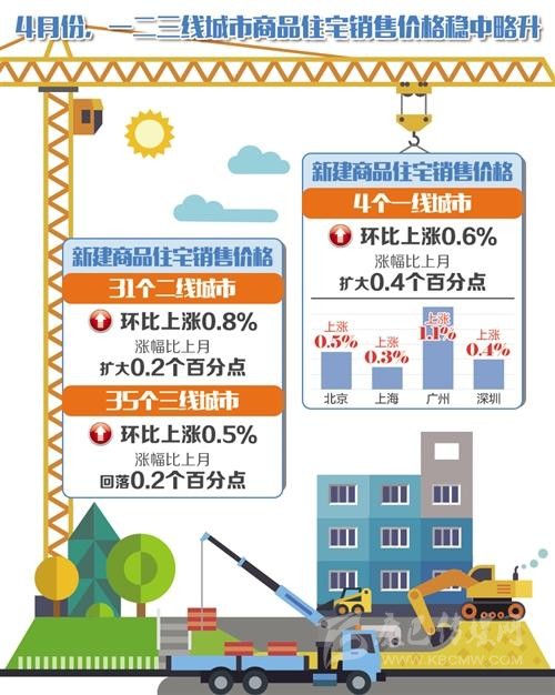國家統(tǒng)計局城市司高級統(tǒng)計師劉建偉表示,4月份一線城市新建商品住宅和二手住宅銷售價格環(huán)比漲幅均略有擴(kuò)大;二線城市新建商品住宅銷售價格漲幅擴(kuò)大,二手住宅漲幅回落;三線城市新建商品住宅銷售價格漲幅回落,二手住宅漲幅微升。