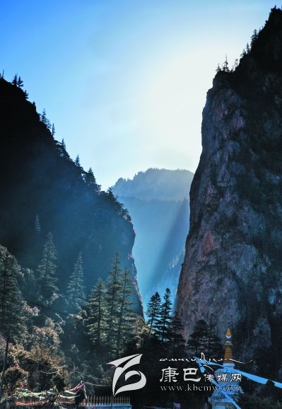 進(jìn)得溝來,卻又是另一番景致。溪水在窄細(xì)的深谷中忽隱忽現(xiàn),水聲叮咚,時而從碎石卵灘下潛淌,時而冒出雪花樣的身影,不張揚(yáng),含靦腆,與兩邊千仞峭崖的兇猛樣恰成強(qiáng)烈對比。此時容不得你不抬頭望山,望天了。極盡險峻的峭壁奇峰,危巖巨石,陰面如潑了墨暈,陽面露了慘白,硬硬地把個溝谷擠成了“一線天”,駭?shù)谜锪锏奶焐弦粌蓤F(tuán)亂云也不敢停歇片刻,欲飄走,卻又被錯落參差的山峰撕得七零八落。更有那墨黑如黛的松柏齊齊地排隊(duì)豎立在危崖峭壁間,或一兩階,或三四階,如挎刀武士護(hù)著峭崖,又如黑大漢長的亂糟糟的絡(luò)腮胡,徒增添了猙獰之貌。傳說皮察溝內(nèi)有座黑教的神山——呷拉神山,每到“朝山會”,農(nóng)牧民前去神山朝拜。然而,呷拉山頂不知何時棲居了一只碩大的“夏甲曲絨”(意為一種兇惡的鳥),不時將村里百姓的牛、羊叼到山頂吞食。藏王格薩爾得知此事,決心要除掉“夏甲曲絨”。 “夏甲曲絨”得知格薩爾王大軍前來征服它,十分懼怕,數(shù)日藏于洞中不敢出來。格薩爾王隱身于巖石背后,讓王妃珠牡設(shè)法引“夏甲曲絨”出洞。“夏甲曲絨”形體碩大,棲息的洞無法掩其全身,頭部露在外面,時時觀察動靜。珠牡到接近洞口的地方,滔滔不絕地贊譽(yù)“夏甲曲絨”長得美麗,它禁不住贊美,漸漸地伸長頭頸,最后驕傲地露出潔白的全身,并高昂著頭。格薩爾王趁機(jī)迅速張弓搭箭,一箭射中“夏甲曲絨”的頸部,血流滿山,以后這座山便變成了紅山。當(dāng)“夏甲曲絨”負(fù)痛逃至皮察溝“一線天”時已精疲力竭,便停留在山崖中。格薩爾王隨即趕到,藏于灌叢,背靠巨石用腳一蹬(至今天一巨石呈凹形,似有人蹬過),再次射中“夏甲曲絨”。“夏甲曲絨”負(fù)痛逃去,停在覺然村一巨石上做垂死掙扎時,它的爪爪在巨石一抓了無數(shù)道溝痕,后人把這個巨大石稱為“鬼抓石”……我無意去尋找“紅山”、“腳蹬石”、“鬼爪石”等,也沒想深究格薩爾除妖是否用過“美人誘惑計”,但卻在溝谷里發(fā)現(xiàn)一個與眾不同的現(xiàn)象:在一處窄小的谷地路傍,長滿了雜枝黑蔓的灌叢,灌叢上彩幡密布,鉆進(jìn)灌叢,里邊竟然塑了一尊格薩爾王的神象,神象不高大,卻威儀,的確像是藏在崖壁下灌叢中……很容易讓人想到故事中的情節(jié)。