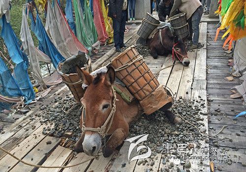 這是318和317國道都不通過的甘孜州白玉縣,從白玉縣城通往建設鄉(xiāng)德沙村的路是一條木制棧橋,2014年5月4日的中午,兩頭騾子在300斤石料的重壓下踩斷了中間的橋板,兩條前腿從踩碎的木板處懸著,騾子發(fā)出粗壯的喘息聲,無法掙扎,不能動彈。棧橋上有路過的藏民,手中旋轉(zhuǎn)著轉(zhuǎn)經(jīng)筒,他口中念念有詞:騾子啊,你還沒有得到解脫。一群來自外地的游客都很驚詫。 騾子運輸隊的王玉海,在過往行人和同行的騾隊鄉(xiāng)親的幫助下,先卸下騾子身上背負的碎石,然后手伸到騾子前腿根處,用力抬起騾子的前身。在查看騾子沒有受傷后,王玉海把這兩只騾子牽到騾隊最后面,然后,引著另外5只負重的騾子,從橋靠左邊的雙層木板橋面上通過,騾子隊受到驚嚇,不愿意上橋,王玉海安撫了一會兒騾子隊后,在同伴的協(xié)作下,前面牽引,后面驅(qū)趕,終于,王玉海的7只騾子過橋,其他8個同伴的50多頭負重的騾子也一一通過。