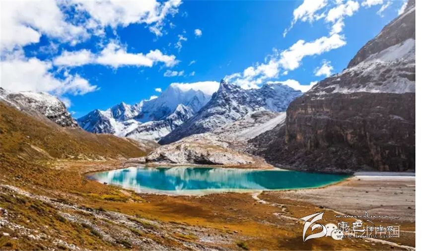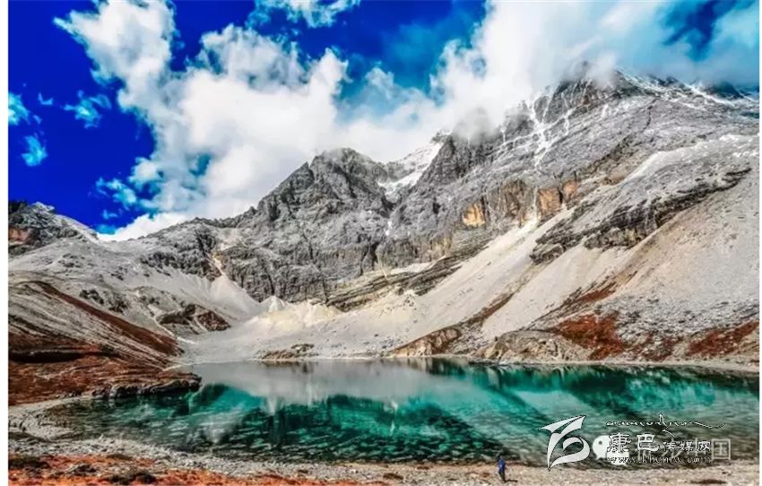 三神山中間的牛奶海,美麗的高原堰塞湖,面積0.5公頃,海拔4500米,四周雪山環(huán)繞,湖水清瑩碧藍(lán),山上成瀑,以其玲瓏秀雅水色翠藍(lán)而著名,牛奶海上方有大片的冰川。傳說每年春暖花開之時(shí),湖水會(huì)像牛奶一樣潔白如瓊漿,并因此得名牛奶海。