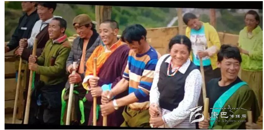 一群腰圍圍裙的藏族人,手執(zhí)木夯(hang),分成兩組,在勞動(dòng)時(shí)此起彼伏的唱著夯屋頂時(shí)的勞動(dòng)歌。歌聲統(tǒng)一著步調(diào),木棒夯土的聲音是節(jié)奏,一輪又一輪的合唱。這就是“打阿嘎”。