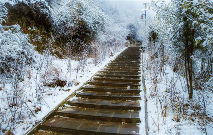 鋪滿“雪凇”的山谷,遠(yuǎn)看像森林撒上了一層糖霜,有人可能會(huì)誤認(rèn)為是東北的“霧凇”,但這種“雪凇”的白色底下還能看見隱約看到秋林的枝葉,獨(dú)有的南國(guó)雪景讓人產(chǎn)生“似花非花”的迷惑。