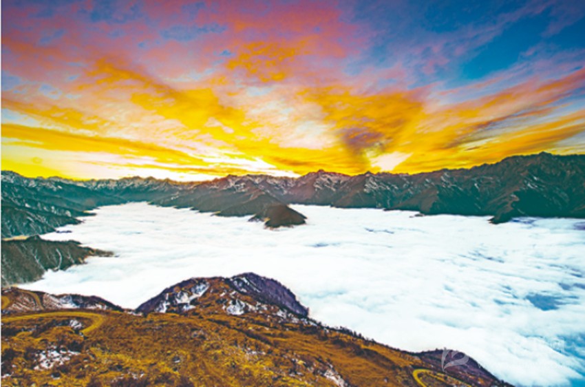 一條群山環(huán)繞的河谷,從衛(wèi)星圖上看,它就像一片樹葉,水系是莖脈,森林是葉的紋理,群山是齒狀起伏的葉緣。灣壩地區(qū)三面皆被海拔在4500米以上的高大山體環(huán)峙,僅南側(cè)有窄如細縫的峽谷通往外域,自然地理環(huán)境相對封閉原始,山谷風(fēng)作用就此產(chǎn)生。即當(dāng)太陽出來后,山坡比谷底更早被加熱,山坡空氣受熱膨脹,密度變小,利于中午前后谷底的氣流補償進來,形成向上抬升,增加了上升動力;加上云層的高度小于山頂?shù)母叨?,就形成了宏偉壯闊的云海景觀。灣壩云海是整個甘孜州規(guī)模最大的云海之一,也是最容易見到的云海,其云海規(guī)模達上萬畝,基本全年都可見,一年中最佳觀賞時間是春夏之際。
