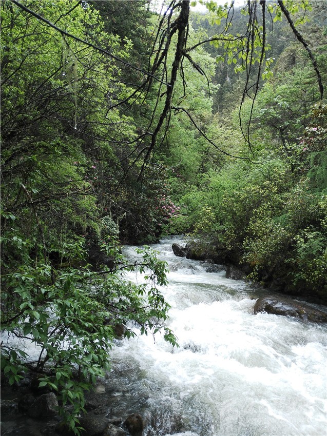 杜鵑花!又有美女的驚叫把我們的視線拉到了另一個(gè)方向,也即我們左手山坡上,一大片姹紫嫣紅的杜鵑花正灼灼綻放于郁郁蔥蔥的林木之間。而這時(shí)也就發(fā)現(xiàn)了,左手邊其實(shí)是一片花的海洋,各類不知名的花朵競(jìng)相爭(zhēng)艷,把拉角溝初晴的時(shí)空打扮得格外妖艷。于是眾人紛紛拿出手機(jī)兼相機(jī),將這難得一見(jiàn)的景致拍攝下來(lái),而這一過(guò)程中,美女們總忘不了騷首弄姿地把自己擺進(jìn)畫(huà)面之中,雖然這些美女都是妖婆級(jí)的美女了。至于男士,多數(shù)則呵呵笑著看著,頗有閑庭信步、云卷云舒之意。