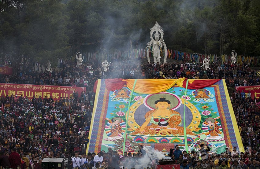 農(nóng)歷四月初八是釋迦摩尼的誕辰,這一天也是以藏傳佛教為主要信仰的康定人的重要日子。就連周邊地區(qū)的藏民也全部盛裝趕來(lái)。每逢這天,民眾自東關(guān)出、上跑馬山,寺廟的喇嘛們抬出巨幅唐卡畫(huà)卷曬佛,在法號(hào)聲聲中,眾人禮佛朝拜。在熱鬧的歌舞表演之后,再沿公主橋下,轉(zhuǎn)金剛寺、南無(wú)寺,沿阿里布果轉(zhuǎn)山步游道至子耳坡返回,轉(zhuǎn)山一圈,繞城一周,誦佛萬(wàn)變,以紀(jì)念佛祖誕辰,并祈禱吉祥安康。