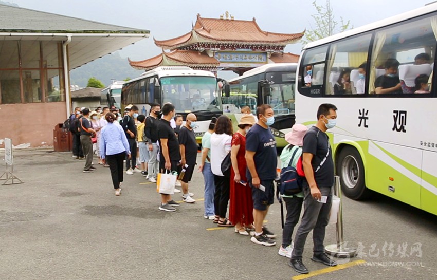 游客有序登上觀光車。