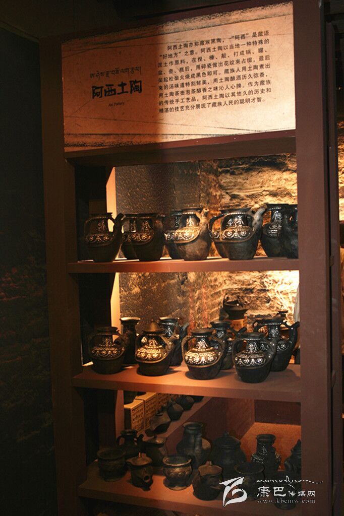 阿西土陶是藏家傳統(tǒng)土法制作的手工藝品,又稱藏族黑陶,因其燒制后呈黑色而得名。阿西土陶以當(dāng)?shù)匾环N特殊的泥土為原料,加上其他兩種泥土混合而成,制作中不斷地捏、錘、敲、打,使之成型,還要用碎瓷做出花紋來(lái)點(diǎn)綴,最后架起松柴點(diǎn)火燒,在燒紅的土陶上灑上麥糠就呈現(xiàn)出黑色了。阿西土陶主要表現(xiàn)為陶鍋、陶罐、陶盆、陶壺、陶瓶等形式。最初,當(dāng)?shù)厝艘蕴斟伒葥Q取其它地方的糧食或其它物品,現(xiàn)今的阿西土陶則已經(jīng)走向市場(chǎng),更多地作為旅游商品和本地人的家庭裝飾品。