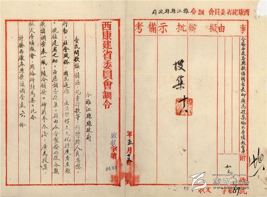 在舊檔案里翻出一份有劉文輝署名的訓(xùn)令,這是在民國27年(即1938年)8月1日發(fā)往“西康雅江縣政府”的訓(xùn)令,與其它多如牛毛的訓(xùn)令不同的是,這份訓(xùn)令竟然所說的事情是不為人們所重視的“歌謠”收集。