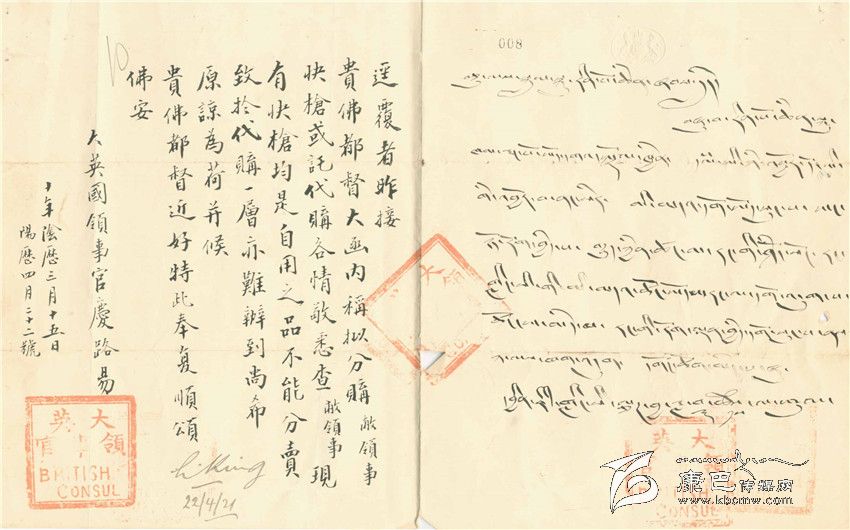 可以肯定的是,這就是給某位活佛的復信,除了稱呼佛都督(這是在當時對活佛的通行的敬稱)可以看出外,還有藏文可以佐證。這張紙片上寫道:昨接貴佛都督大函,內稱,擬分購敝領事館快槍或托代購各情敬悉。查敝領事現(xiàn)有快槍均是自用之品,不能分賣。致于代購一層,亦難辦到,尚希原諒為荷,并候貴佛都督近好,特此奉復,順頌佛安。署名是大英國領事館官慶路易,日期為十年陰歷三月十五日,陽歷四月二十二日。在公章下面注有公元1922年4月22日。
