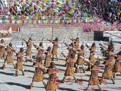 10月26日,在甲居藏寨,處處洋溢著豐收和歡樂(lè)的氣氛,人們扶老攜幼,身著節(jié)日的盛裝走到一起,來(lái)共同慶祝丹巴嘉絨風(fēng)情節(jié)的順利召開。在一塊空地中,搭建了臨時(shí)的舞臺(tái),看臺(tái)上,幾座古碉模型傲然挺立,在不遠(yuǎn)處,一座古碉矗立在一座小山包上,與古碉模型遙相呼應(yīng)、相映成趣。上午9時(shí)40分,當(dāng)節(jié)目主持人宣布嘉絨風(fēng)情節(jié)正式開始時(shí),一束束搖曳的煙花向空中飛去,在空中炸響后,散發(fā)出五顏六色的煙霧,其中有的還幻化成幾多小小的降落傘,就像多多盛開的鮮花在空中綻放。演出現(xiàn)場(chǎng)前的大地和遠(yuǎn)處的小山坡上到處都站滿了熱情的觀眾,合著禮花的爆裂時(shí)的響聲,將手中的小紅旗展開,高舉過(guò)頭頂,有節(jié)奏的左右搖動(dòng),霎時(shí)間,整個(gè)現(xiàn)場(chǎng)成為了紅色的海洋。
