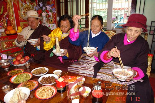 巴塘人一年當(dāng)中有很多重要的節(jié)日,而最重要的莫過于過春節(jié)。隨著農(nóng)歷新年的來臨,巴塘人過春節(jié)的氛圍也越來越濃烈了。掃塵、貼春聯(lián)、殺年豬、罐血腸、樹經(jīng)幡、獻“切瑪” 、曬牛肉干、做長面、炸“花茹” 、 釀青稞酒等等,人們臉上綻放出春天的笑顏,喜逐顏開迎候新春佳節(jié)的到來。而在眾多的風(fēng)味飲食中,炸“花茹” 、 吃長面(當(dāng)?shù)厝朔Q之為“金絲面”)是巴塘人春節(jié)時家筵中必不可缺的美食佳肴。