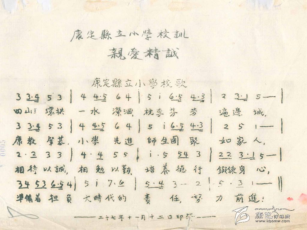 在眾多的民國(guó)教育檔案中,關(guān)于西康省各地學(xué)校的學(xué)生花名冊(cè)、學(xué)生成績(jī)表、學(xué)校經(jīng)費(fèi)運(yùn)用情況,以及教職工領(lǐng)取工薪的領(lǐng)條和表格等等有相當(dāng)大的一部分。難得的是,在這些檔案中竟然出現(xiàn)了兩份“歌譜”。細(xì)看卻不只是“歌譜”,而是兩所小學(xué)把自己學(xué)校的“校訓(xùn)”寫成的“校歌”。其中,一份是康定縣立小學(xué)依據(jù)校訓(xùn)“親愛(ài)精誠(chéng)”寫成的校歌,另一份是日地短期小學(xué)依據(jù)校訓(xùn)“智仁勇”寫成的校歌。通過(guò)這兩份“校歌”,可以看到當(dāng)時(shí)小學(xué)教育已經(jīng)較為正軌,還開(kāi)設(shè)有音樂(lè)課。“校歌”的內(nèi)容積極向上,充盈現(xiàn)在所說(shuō)的“正能量”,鼓勵(lì)學(xué)生努力學(xué)習(xí),成為有擔(dān)當(dāng)?shù)娜恕?/div>