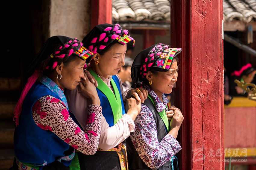 在魚通地區(qū),不少人還保持著古老的裝束,男子穿青色或黑色的長布衫,用布帶束腰,勞作或天冷時會在外加一件用動物皮加工做成的皮褂子,老人以青布包頭,帕長約3丈左右,纏成大盤頭。女子也穿長衫,頭戴方形青色頭帕,腰系圍腰帕。頭帕繡有彩色花邊,發(fā)辮用青色、藍(lán)色或紅色的絨線盤于頭帕之上。圍腰帕為梯形,上窄下寬,邊緣用藍(lán)色或淺綠色布料做裝飾。圍腰帕分為兩種,一種繡著各種精美圖案,一般在重大節(jié)日和喜宴上穿戴,一種比較簡潔素凈,一般在日常生活中穿戴。