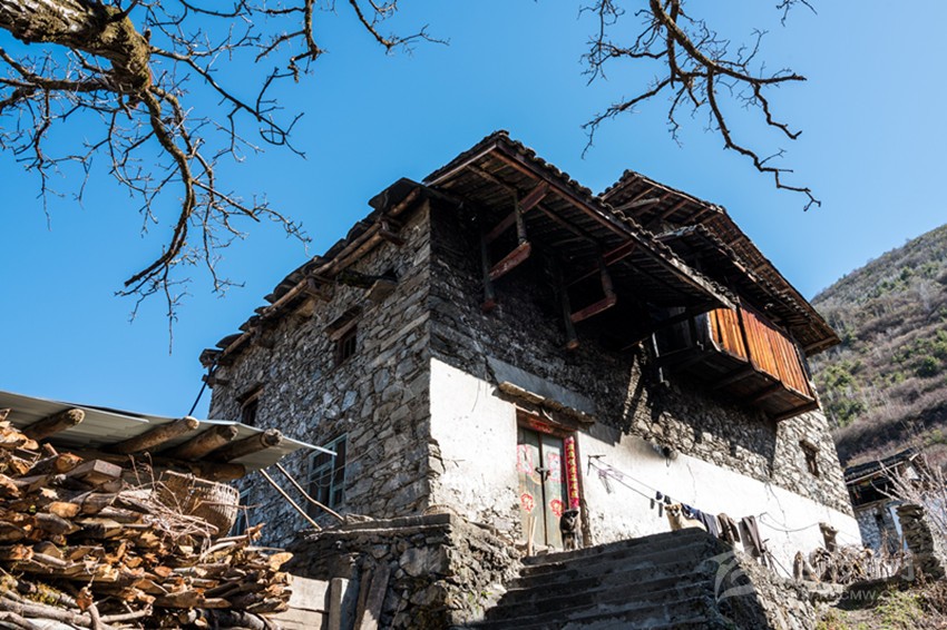 魚通人的房屋符合古人對居所背山面水的要求,多依山而建。房屋為木石混合結(jié)構(gòu),以片石木材和黃泥為主要材料建成,當(dāng)?shù)厝朔Q之為“碉房”。房屋用石塊壘起,以木頭為墻筋,每隔一定高度,橫砌進(jìn)入石塊,融為一體,使之更為堅固牢靠?!暗锓俊?/span> 一般為三層或四層,呈四角或六角形。底層為關(guān)牲畜。第二層為“堂屋”, 在過去,是集做飯、吃飯、烤火、家人日常活動為一體的場所,地上設(shè)有火塘、灶,并在火塘上設(shè)石制三腳鍋莊或鐵三腳。第三層為各居室,有的設(shè)有貯藏室和會客屋。頂層為經(jīng)堂,室外為曬壩,作打場、曬場用。有些在外側(cè)設(shè)有一小吊腳樓,可堆放雜物。隨著時間的流逝,古老的碉房已無法滿足現(xiàn)在居民的需求,已很少有人居住,而新式碉房在傳統(tǒng)的基礎(chǔ)上開始出現(xiàn)。