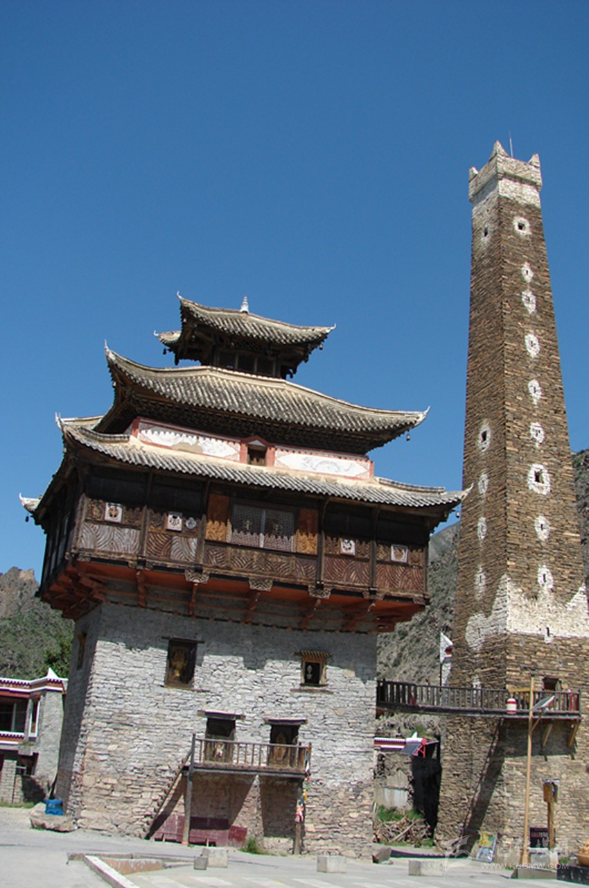 站在廣場中央仰望,碉樓有十五層高,約有二十余米,其外墻為片石壘砌,并附建有經(jīng)堂碉及過街樓,防御性極強。整座碉樓在修建中,層層收分,從墻面往上看,傾斜面在八十度左右。到達碉樓頂,面積只有四平米左右,在每一層樓里,都有外窄內寬的窗戶,是典型的堡壘式射擊孔。在通往碉樓頂?shù)拿恳粚臃块g內,都有一根獨木梯連接著。第一層為石材壘筑的實心體,這種建筑方式為碉樓下大上小、重心向內、穩(wěn)定性強的特點奠定了牢固的基礎。碉樓內,水源路網(wǎng)環(huán)環(huán)相通,倉儲空間很大。第二層為放置日常用品的地方,房門開在第三層,連接地面的依然是一根獨木梯,若遇敵人來犯時,人們便從獨木梯上攀援而上,再將獨木梯抽取。這樣,一座碉樓就固若金湯,只需從射擊孔中射出箭,或者從碉樓頂?shù)乃慕侨酉乱粔K塊巨石,不管敵人是如何的孔武有力,還是擁有如何的謀略,在碉樓面前都會束手無策,最后只能選取最原始的進攻方法——圍而不攻。坐待碉樓里的人彈盡糧絕之日,不過,人們在修建碉樓時,已充分的考慮了這些因素,在每一層樓里都儲備了足夠幾年之需的食物和水,這樣,往往是圍攻的人耐不住性子,最后只好悻悻然退卻。