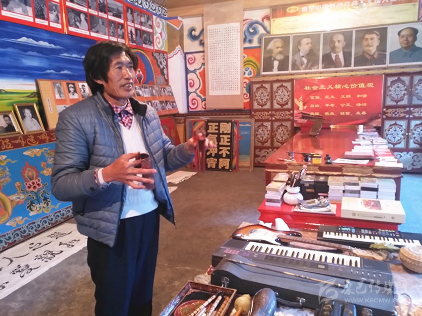 到了九龍,記者幾次打算采訪呷爾鎮(zhèn)原文化站站長王長生。王長生,人稱王老表。65歲的王長生本該退休在家安享晚年,然而,作為九龍乃至甘孜州的文化名人以及他在開展群眾工作方面的建樹,退休后,他依舊是個大忙人,黨的十九大勝利召開后,作為省級優(yōu)秀宣講員,為了搞好宣講,他潛心備課,黨的十九大精神宣講全面鋪開后,他與宣講團成員一道奔赴瀘定、丹巴、雅江、九龍等縣農(nóng)牧區(qū)宣講。12月12日,他忙里偷閑,在美觀整潔的家里接受了記者的采訪,多才多藝的王長生向記者展示了他高超的才藝。