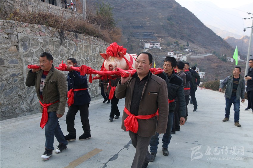 5個(gè)村民將年豬抬到秤上。360斤。村民為年豬準(zhǔn)備大紅花。準(zhǔn)備紙錢(qián)、香蠟。9點(diǎn)整,殺豬匠開(kāi)始了他的工作,在眾人齊心協(xié)力下,光溜溜的年豬被打整干凈?!氨S游覀兇鍋?lái)年風(fēng)調(diào)雨順、五谷豐登,村民平安健康?!贝逯欣险呔催^(guò)天地后,8個(gè)身強(qiáng)力壯的村民站在年豬旁,豎著拇指齊聲說(shuō),今年家家戶戶還要養(yǎng)大肥豬。抬著年豬,村里的中老年人簇?fù)碇?,走在最前面,唱著悅耳的民謠,大意是歌唱幸福生活的,迎著2018年的第一縷陽(yáng)光,村民們喜氣洋洋。到村里來(lái)的游客蜂擁拍照。