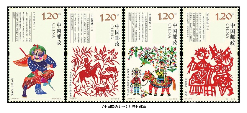 2018年1月24日,中國郵政發(fā)行《中國剪紙(第一組)》特種郵票,全套4枚。這是中國郵政繼1959年1月1日發(fā)行的《剪紙》特種郵票59年后重新發(fā)行的《中國剪紙》系列郵票。全系列郵票計劃發(fā)行4組,每組4枚。這次發(fā)行的第一組4枚郵票入選內(nèi)容分別是被列入第一批國家級非物質(zhì)文化遺產(chǎn)名錄的北方四處剪紙傳承人的作品:第一枚“河北蔚縣·蘆花蕩”,河北蔚縣剪紙歷史悠久,風(fēng)格獨特,題材多取自于人物,造型設(shè)計疏密有致,點染絢麗鮮艷。此幅作品作者王老賞(1890-1951),河北省蔚縣南張莊村人;第二枚“內(nèi)蒙和林格爾·牧羊圖”,內(nèi)蒙古和林格爾剪紙多反映游牧生活,具有古拙浪漫、質(zhì)樸奔放、熱情率真的藝術(shù)風(fēng)格。此幅作品作者張花女 (1903-2004),和林格爾縣董家營鄉(xiāng)曹老八夭村人;第三枚“陜西旬邑·江娃拉馬梅香騎”,陜西旬邑的彩色剪紙具有民間美術(shù)的鮮活靈動,無拘無束,形象稚拙而又鮮明,構(gòu)圖緊密完滿而又單純明快,色彩對比強烈而又協(xié)調(diào)適度。此幅作品作者庫淑蘭(1920-2004),陜西咸陽市旬邑縣張洪鎮(zhèn)赤道鄉(xiāng)富村人;第四枚“山西新絳·小別母”,山西新絳剪紙藝術(shù)源遠(yuǎn)流長,內(nèi)容豐富多彩,尤以人物見長,戲曲題材作品更為突出,構(gòu)圖簡潔飽滿、精煉極致,粗獷中見典雅,簡煉而不簡單。此幅作品作者蘇蘭花(1906-1995),山西運城市新絳縣澤掌鎮(zhèn)北蘇村人。