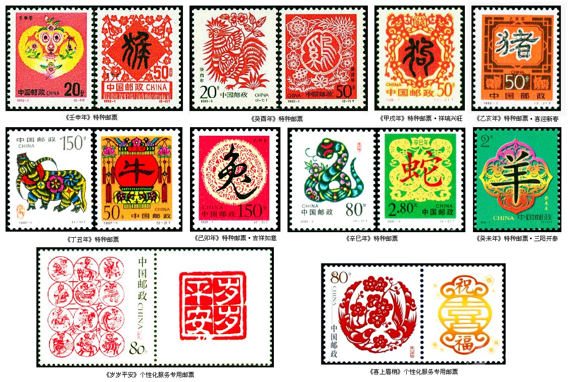 剪紙作為藝術(shù)百花園中的一朵奇葩,在我國郵票圖案設(shè)計中應(yīng)用也非常廣泛。由于傳統(tǒng)的民間剪紙有著濃郁的吉祥喜慶氣氛,因此在我國近些年發(fā)行的生肖郵票中多次出現(xiàn)剪紙藝術(shù)。在第二輪12套24枚生肖郵票中的剪紙圖案分別有1992年《壬申年》的“猴桃獻(xiàn)瑞”和“喜鵲登梅”、1993年《癸酉年》的“雄雞報曉”和“四季吉祥”、1994年《甲戌年》的第二枚“祥瑞興旺”、1995年的《乙亥年》的第二枚“喜迎新春”、1997年的《丁丑年》的“金牛奮蹄”和“牛耕年豐”、1999年《己卯年》的第二枚“吉祥如意”、 2001年《辛巳年》的“祥蛇祝?!焙汀跋檫\普照”以及2003年的《癸未年》第二枚“三陽開泰”等。這些郵票中剪紙圖案有的直接取材于民間,有的則是在原作基礎(chǔ)上再創(chuàng)作。如“雄雞報曉”一枚,圖案選用的是河北省獻(xiàn)縣本齋鄉(xiāng)鄧家莊蔡蘭英老人的剪紙“百雞圖”中的一幅,而“金牛奮蹄”一枚,圖案是根據(jù)山東高密民間藝人齊秀花的剪紙“媳婦騎牛”再加工創(chuàng)作而成的。在我國發(fā)行的祝福系列個性化服務(wù)專用郵票中也有吉祥喜慶的剪紙圖案,即2005年11月6日的《歲歲平安》和2005年11月11日的《喜上眉梢》等。