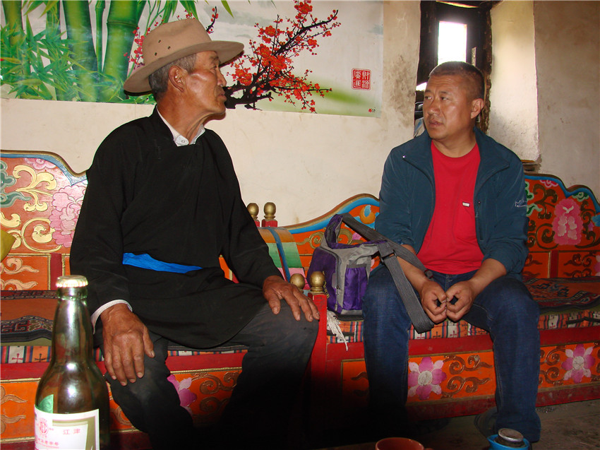 半扇門鄉(xiāng)臘月山一村就座落在這條溝谷里。村寨中,山歌傳承人孫文權(quán)不但在村寨里帶動青年男女們唱響了“啦啦調(diào)”山歌,也帶動了周邊村寨中的青年男女們一起學(xué)唱,山歌在這里得到了很好的保護和傳承。為了對“啦啦調(diào)”山歌傳承人孫文權(quán)大叔有一個比較系統(tǒng)的了解,在一個春日的早晨,我背上相機、攝像機等采訪器材向著臘月山一村進發(fā)。走在山道上,一夜雨后,遠處一片白霧從遙遠的墨爾多神山與九道溝叢林之間飄來,悠悠晃晃的,最后罩在小金河谷上,彌漫開來,一會兒的功夫,就將河谷兩岸的樹木和藏寨都擁進自己的懷里。走了許久,眼前的山道明顯的開闊了許多。幾座白色的藏房掩映在綠樹叢中,房屋頂?shù)乃慕巧?,獵獵的風馬旗迎風飄揚。孫文權(quán)的房屋就在眼前這片藏寨中,房屋的外墻上,用淡紅色和黑色的線條勾勒出山川河流的樣子。走進大門,孫文權(quán)大叔熱情的邀請我就座,并為我斟滿酥油茶,我們的話題就從嘉絨山歌“啦啦調(diào)”開始。