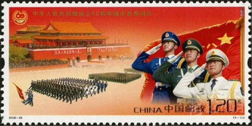 2009年10月1日,中國(guó)郵政發(fā)行的《中華人民共和國(guó)成立60周年國(guó)慶首都閱兵》紀(jì)念郵票一套4枚。其中第1枚“徒步方隊(duì)”(圖6),圖案為中國(guó)人民解放軍三軍儀仗隊(duì)執(zhí)旗手和護(hù)旗手在軍旗下行軍禮。