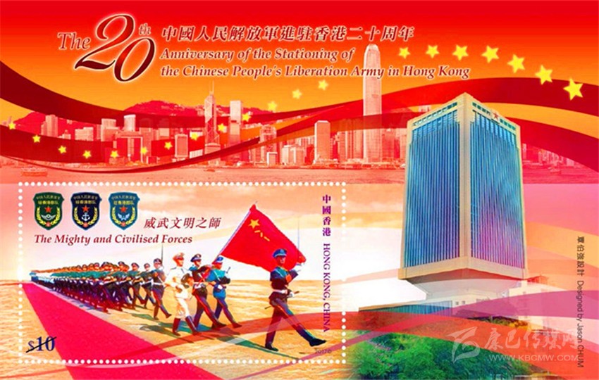 2017年6月20日,香港特別行政區(qū)郵政局發(fā)行了《中國(guó)人民解放軍進(jìn)駐香港二十周年》郵票小型張“威武文明之師”(圖7)。郵票主圖展示的是在“八一” 軍旗引導(dǎo)下,中國(guó)人民解放軍陸、海、空三軍儀仗隊(duì)的威武風(fēng)采。