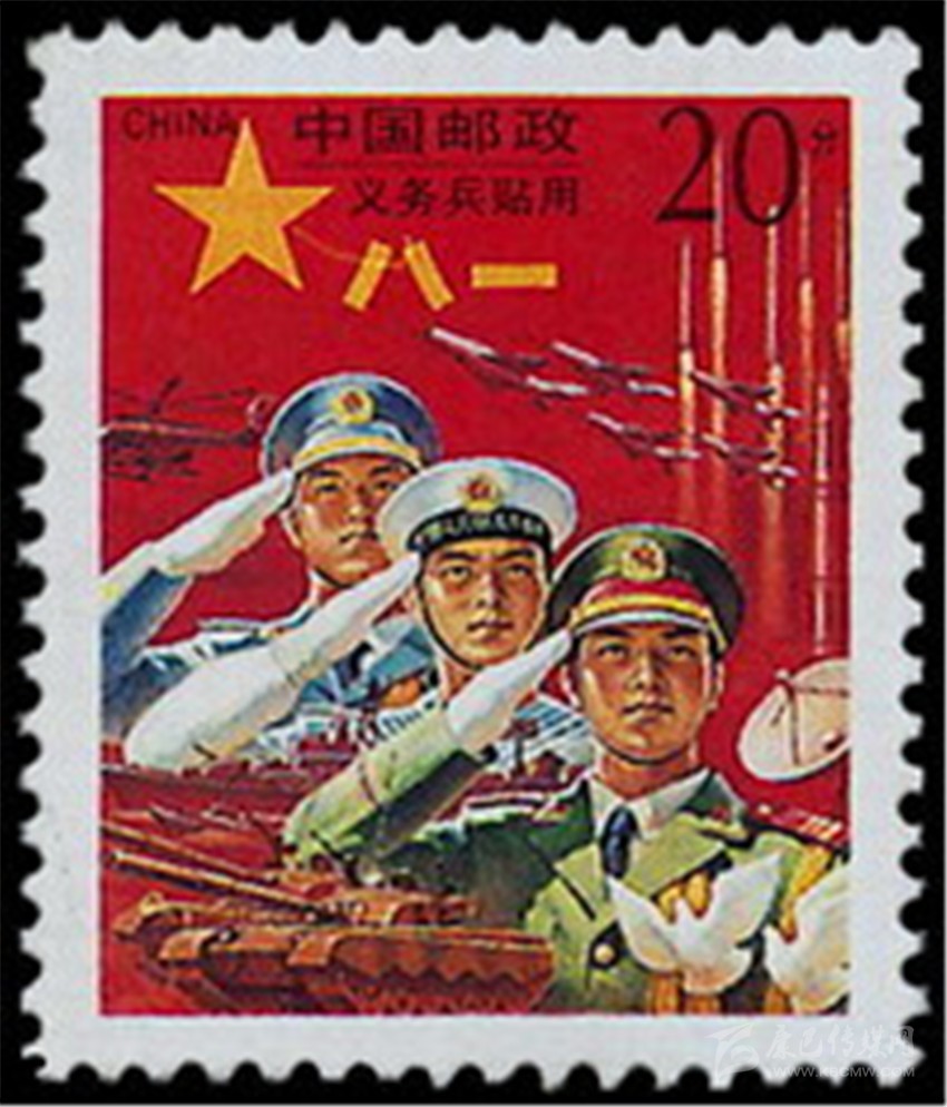 1995年8月1日,原郵電部試發(fā)行一套“義務(wù)兵專(zhuān)用”郵票一套1枚(圖5),票名為“神圣的使命”,圖案以紅光四射的“八一”軍旗為背景,以現(xiàn)代化的飛機(jī)、坦克、火箭和象征和平的白鴿為襯托,畫(huà)面是威武的陸??杖?,顯示我軍鋼鐵長(zhǎng)城般功無(wú)不克、戰(zhàn)無(wú)不勝的精神風(fēng)貌。