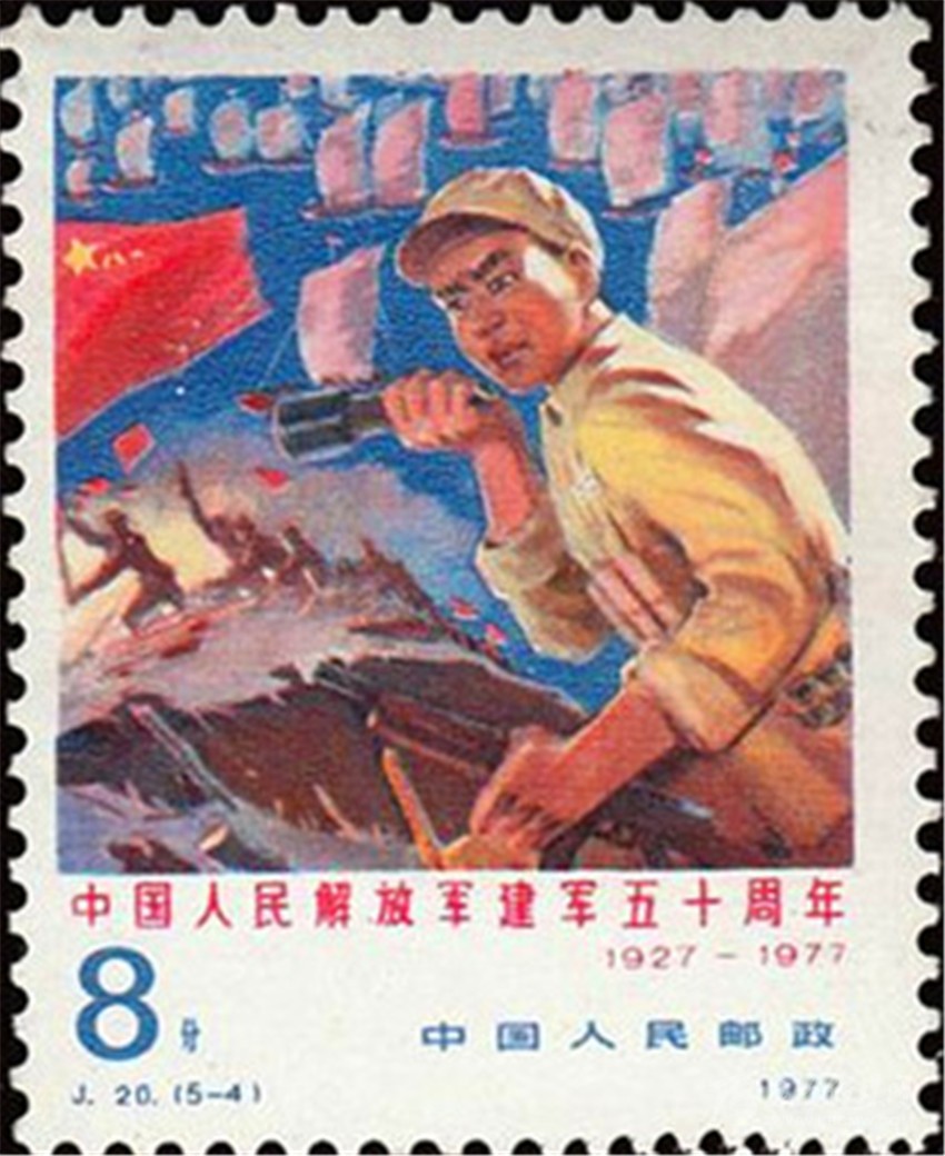 1977年8月1日原郵電部發(fā)行的《中國(guó)人民解放軍建軍50周年》紀(jì)念郵票,其中第4枚“雄師過(guò)大江”(圖3),圖案中一名沖在渡江隊(duì)伍前面的戰(zhàn)士高舉一面“八一”軍旗。