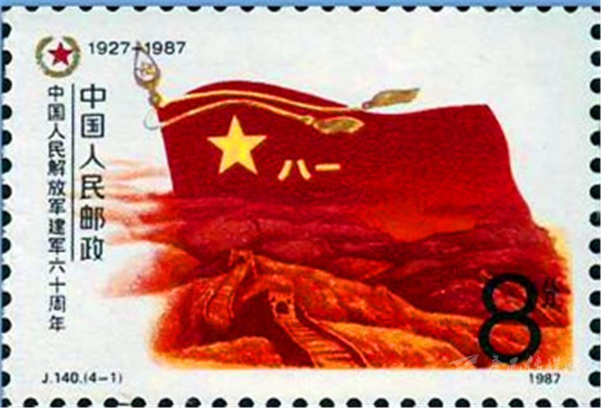 1987年8月1日原郵電部發(fā)行的《中國(guó)人民解放軍建軍60周年》紀(jì)念郵票一套4枚。其中第1枚“軍魂”(圖4),郵票上一面鮮紅的“八一”軍旗迎風(fēng)飄揚(yáng),旗下是蜿蜒的萬(wàn)里長(zhǎng)城,代表了中國(guó)人民解放軍是保衛(wèi)祖國(guó)和人民的“鋼鐵長(zhǎng)城”。